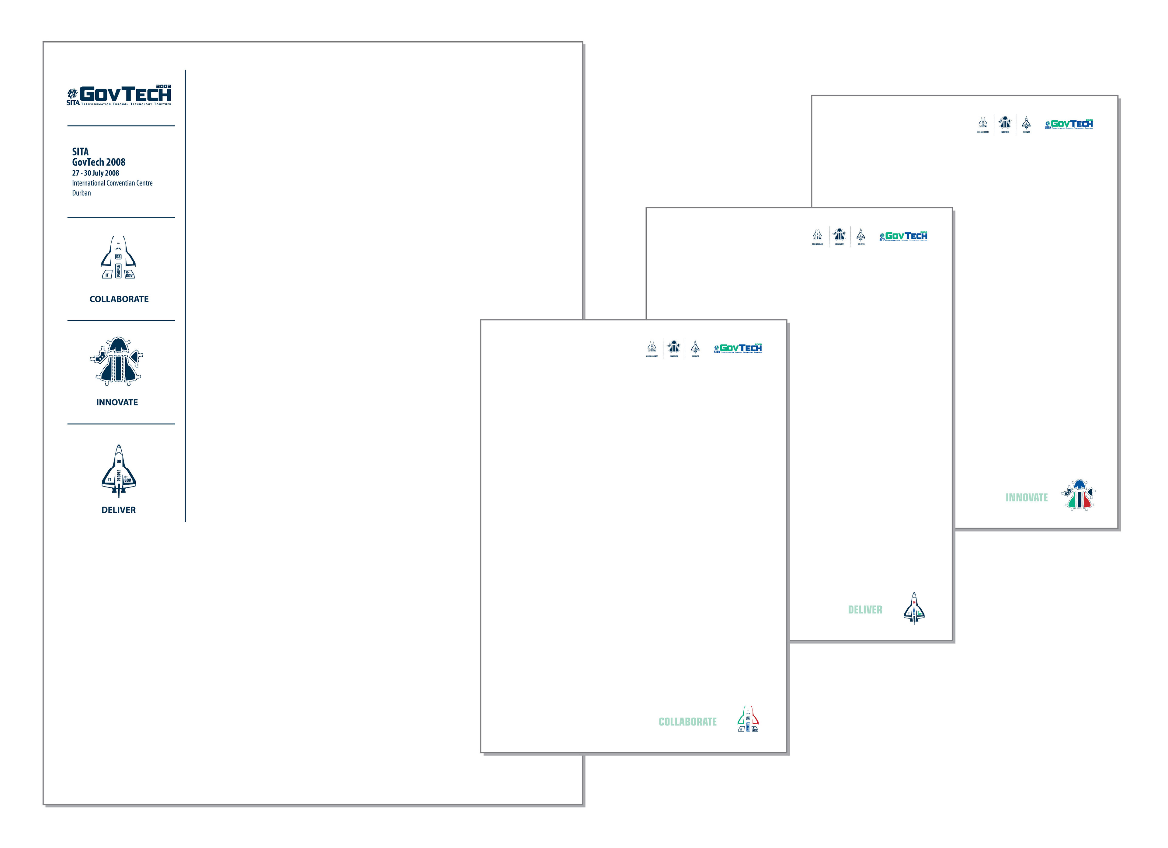The 2008 theme for GovTech, SITA's annual conference, was "Collaborate. Innovate. Deliver." I took the idea of a "paper plane" that consist of different parts that's put together as the concept: the different stickers of the plane coming together ("Collaborate"), the blue print of the plane ("Innovate"), and then the final product - stickers and blue print folded and stuck together ("Deliver").